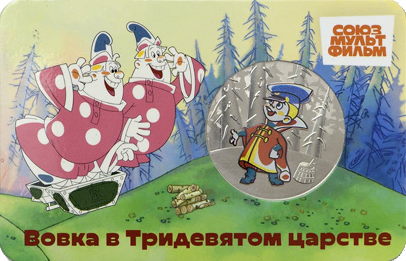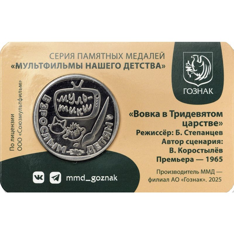 Российский медно-никелевый жетон 2025 года от ММД Гознак из серии «Мультфильмы нашего детства» посвящена мультфильму «Вовка в Тридевятом царстве». У него качество анциркулейтед и селективная окраска. Поставляется в блистере. Тираж: 7000 штук.