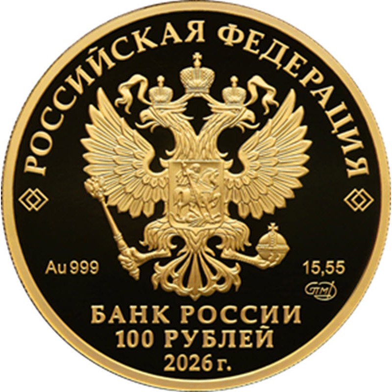 На аверсе изображение Государственного герба Российской Федерации, вверху вдоль канта надпись: РОССИЙСКАЯ ФЕДЕРАЦИЯ, обрамленная с обеих сторон сдвоенными ромбами, внизу под гербом: Au 999 15,55 СПМД (вес и проба золота, монограмма монетного двора), внизу надпись в три строки: БАНК РОССИИ 100  РУБЛЕЙ 2026 г. (банк, номинал, год чеканки).