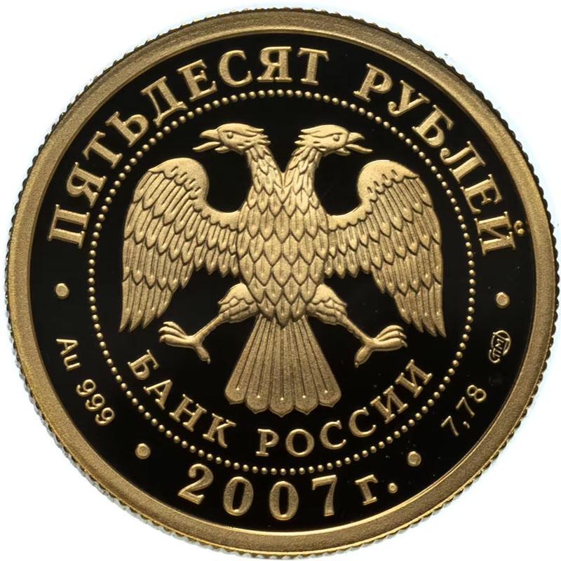 На аверсе изображение двуглавого орла с опущенными крыльями, под ним надпись: БАНК РОССИИ. Вверху вдоль канта надпись: 50 РУБЛЕЙ, внизу: • Au 999 • 2007 г. • 7,78 СПМД • (вес и проба золота, год чеканки, монограмма монетного двора).