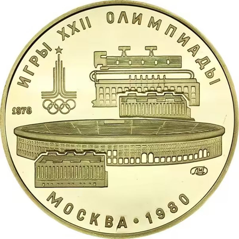 Золотая монета 100 рублей с изображением стадиона «Лужники», входит в состав серии из шести золотых монет «Игры XXII Олимпиады», выпуск которых был приурочен к проведению Олимпийских игр в Москве.