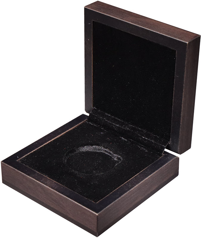 Наружный размер: 90 Х 90 Х 40 мм. Бархатный ложемент черного цвета: диаметр 37 мм, глубина 5 мм.